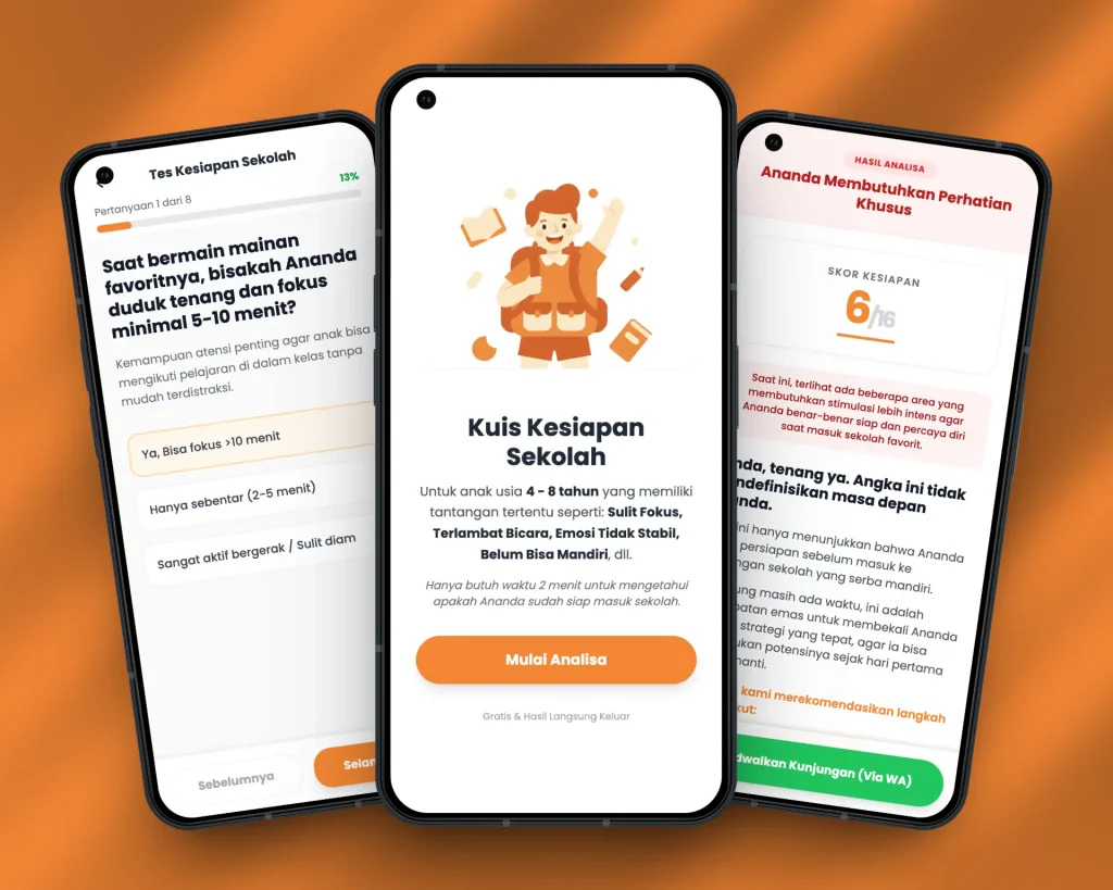 Kami membuatkan web app untuk pusat bimbingan Anak Berkebutuhan Khusus. Orang tua cukup mengisi kuis interaktif yang dirancang secara psikologis untuk menganalisa kesiapan anak masuk sekolah inklusif.