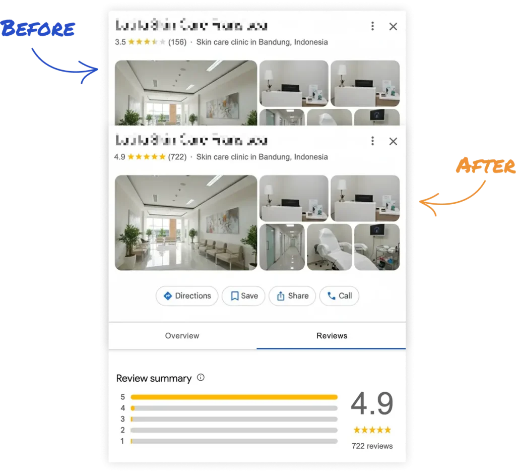 Klinik ini sebenarnya punya pelayanan bagus, tapi gara-gara beberapa review negatif dari antrean yang lama setahun lalu, rating mereka anjlok ke bintang 3.5. Akibatnya, mereka terlempar dari halaman pertama pencarian Google. Calon pasien baru yang mencari “klinik kecantikan terdekat” malah pergi ke kompetitor.